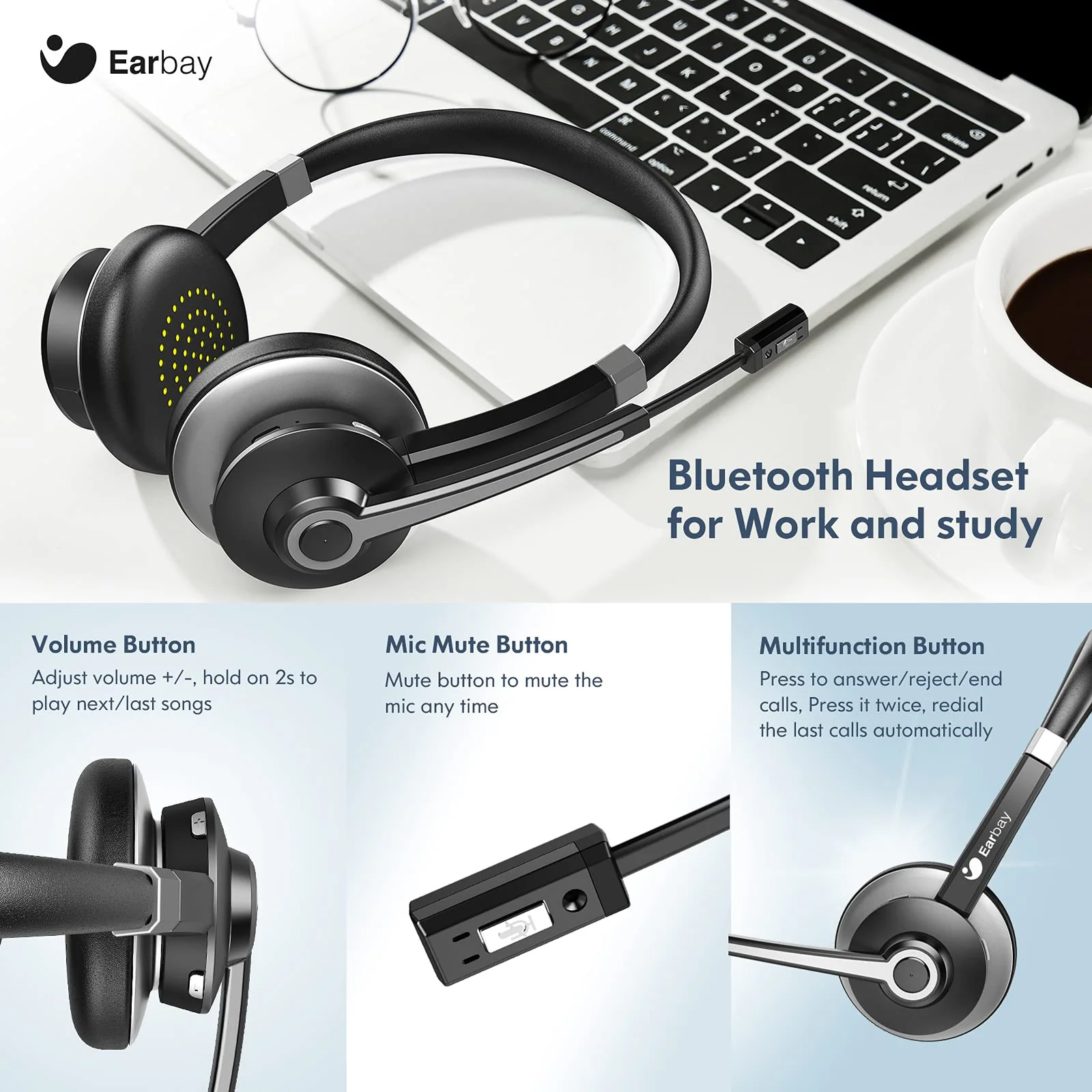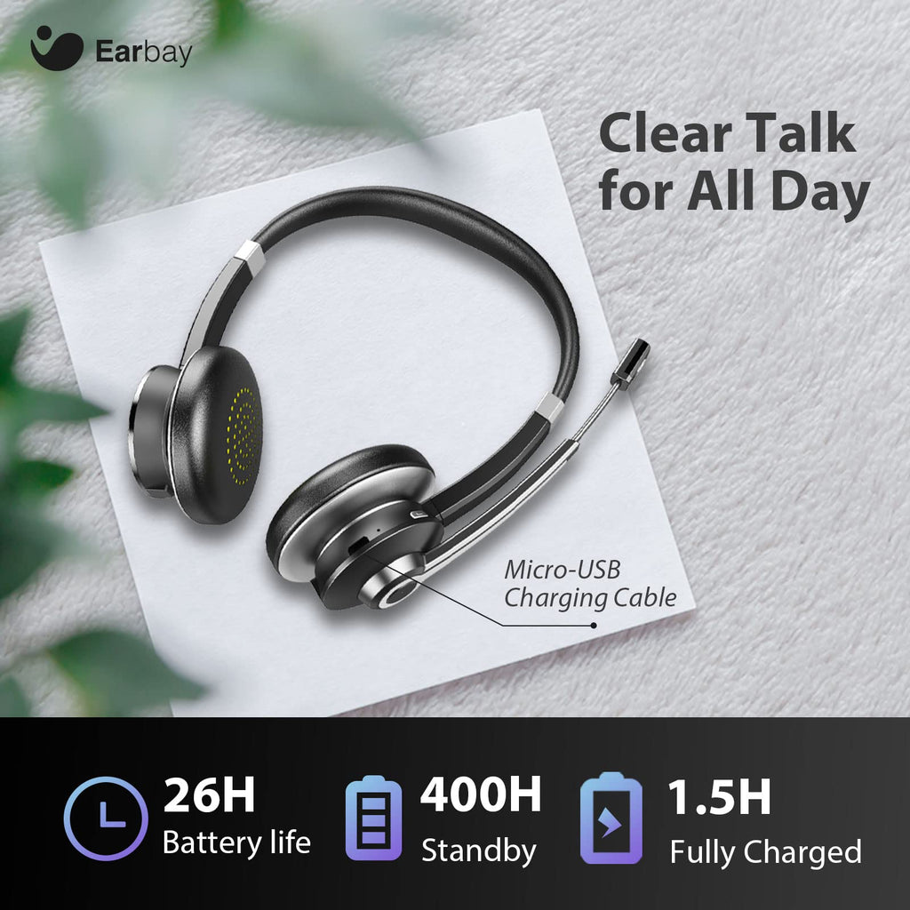 Earbay Wireless Headset with Microphone – Bluetooth Office Headphones Dual Device